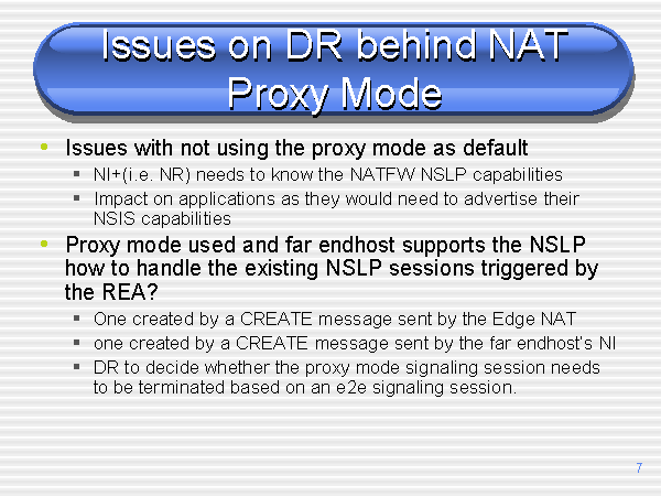 Issues on DR behind NAT Proxy Mode Issues with not using the proxy mode as default NI+(i.e. NR) needs to know the NATFW NSLP capabilities Impact on applications as they would need to advertise their NSIS capabilities Proxy mode used and far endhost supports the NSLP how to handle the existing NSLP sessions triggered by the REA? One created by a CREATE message sent by the Edge NAT one created by a CREATE message sent by the far endhost’s NI DR to decide whether the proxy mode signaling session needs to be terminated based on an e2e signaling session. |