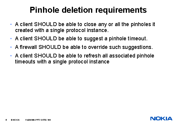 Pinhole deletion requirements A client SHOULD be able to close any or all the pinholes it created with a single protocol instance. A client SHOULD be able to suggest a pinhole timeout. A firewall SHOULD be able to override such suggestions. A client SHOULD be able to refresh all associated pinhole timeouts with a single protocol instance |