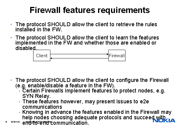 Firewall features requirements The protocol SHOULD allow the client to retrieve the rules installed in the FW. The protocol SHOULD allow the client to learn the features implemented in the FW and whether those are enabled or disabled. The protocol SHOULD allow the client to configure the Firewall (e.g. enable/disable a feature in the FW). Certain Firewalls implement features to protect nodes, e.g. SYN Relay. These features however, may present issues to e2e communications Knowing in advance the features enabled in the Firewall may help nodes choosing adequate protocols and succeed with end-to-end communication. Client Firewall |