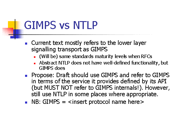 GIMPS vs NTLP Current text mostly refers to the lower layer signalling transport as GIMPS (Will be) same standards maturity levels when RFCs Abstract NTLP does not have well-defined functionality, but GIMPS does Propose: Draft should use GIMPS and refer to GIMPS in terms of the service it provides defined by its API (but MUST NOT refer to GIMPS internals!). However, still use NTLP in some places where appropriate. NB: GIMPS = |