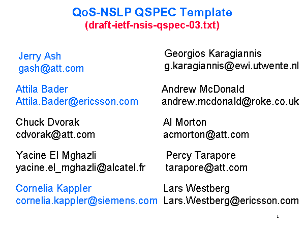 QoS-NSLP QSPEC Template(draft-ietf-nsis-qspec-03.txt) Jerry Ash gash@att.com Chuck Dvorak cdvorak@att.com Percy Tarapore tarapore@att.com Yacine El Mghazli yacine.el_mghazli@alcatel.fr Al Morton acmorton@att.com Andrew McDonald andrew.mcdonald@roke.co.uk Lars Westberg Lars.Westberg@ericsson.com Georgios Karagiannis g.karagiannis@ewi.utwente.nl Cornelia Kappler cornelia.kappler@siemens.com Attila Bader Attila.Bader@ericsson.com |