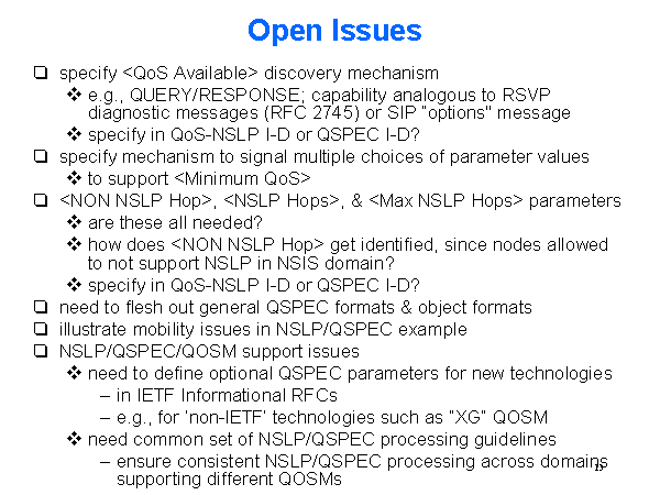 Open Issues specify e.g., QUERY/RESPONSE; capability analogous to RSVP diagnostic messages (RFC 2745) or SIP “options" message specify in QoS-NSLP I-D or QSPEC I-D? specify mechanism to signal multiple choices of parameter values to support are these all needed? how does specify in QoS-NSLP I-D or QSPEC I-D? need to flesh out general QSPEC formats & object formats illustrate mobility issues in NSLP/QSPEC example NSLP/QSPEC/QOSM support issues need to define optional QSPEC parameters for new technologies in IETF Informational RFCs e.g., for ‘non-IETF’ technologies such as “XG” QOSM need common set of NSLP/QSPEC processing guidelines ensure consistent NSLP/QSPEC processing across domains supporting different QOSMs |