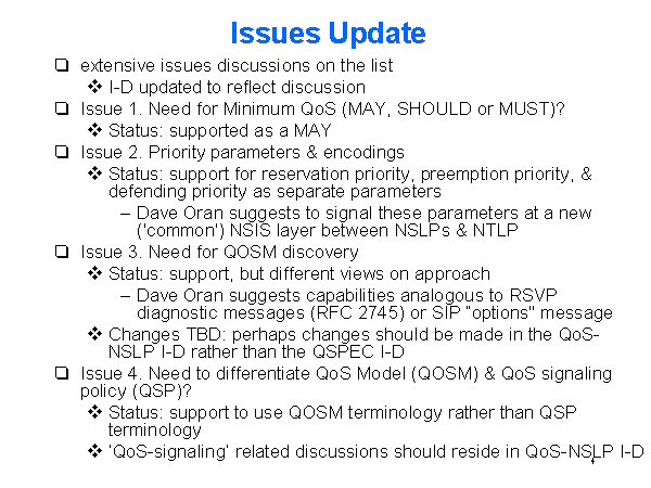 Issues Update extensive issues discussions on the list I-D updated to reflect discussion Issue 1. Need for Minimum QoS (MAY, SHOULD or MUST)? Status: supported as a MAY Issue 2. Priority parameters & encodings Status: support for reservation priority, preemption priority, & defending priority as separate parameters Dave Oran suggests to signal these parameters at a new ('common') NSIS layer between NSLPs & NTLP Issue 3. Need for QOSM discovery Status: support, but different views on approach Dave Oran suggests capabilities analogous to RSVP diagnostic messages (RFC 2745) or SIP “options" message Changes TBD: perhaps changes should be made in the QoS-NSLP I-D rather than the QSPEC I-D Issue 4. Need to differentiate QoS Model (QOSM) & QoS signaling policy (QSP)? Status: support to use QOSM terminology rather than QSP terminology ‘QoS-signaling’ related discussions should reside in QoS-NSLP I-D |