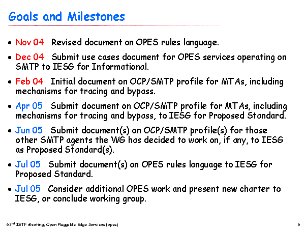 Goals and Milestones Nov 04 Revised document on OPES rules language. Dec 04 Submit use cases document for OPES services operating on SMTP to IESG for Informational. Feb 04 Initial document on OCP/SMTP profile for MTAs, including mechanisms for tracing and bypass. Apr 05 Submit document on OCP/SMTP profile for MTAs, including mechanisms for tracing and bypass, to IESG for Proposed Standard. Jun 05 Submit document(s) on OCP/SMTP profile(s) for those other SMTP agents the WG has decided to work on, if any, to IESG as Proposed Standard(s). Jul 05 Submit document(s) on OPES rules language to IESG for Proposed Standard. Jul 05 Consider additional OPES work and present new charter to IESG, or conclude working group. |