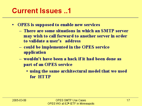 Current Issues ..1 OPES is supposed to enable new services There are some situations in which an SMTP server may wish to call forward to another server in order to validate a user's address could be implemented in the OPES service application wouldn't have been a hack if it had been done as part of an OPES service using the same architectural model that we used for HTTP |