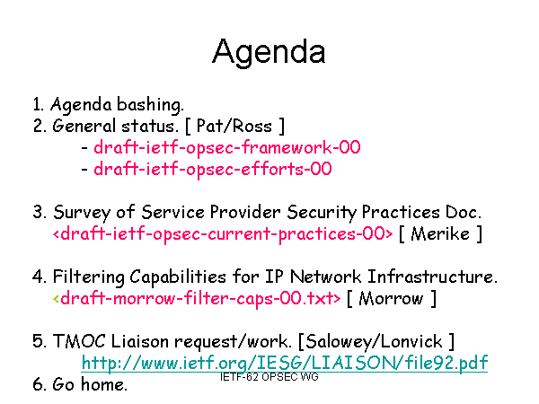 Agenda 1. Agenda bashing. 2. General status. [ Pat/Ross ] - draft-ietf-opsec-framework-00 - draft-ietf-opsec-efforts-00 3. Survey of Service Provider Security Practices Doc. 4. Filtering Capabilities for IP Network Infrastructure. 5. TMOC Liaison request/work. [Salowey/Lonvick ] http://www.ietf.org/IESG/LIAISON/file92.pdf 6. Go home. |