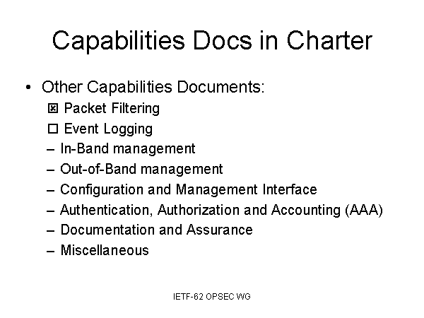 Capabilities Docs in Charter Other Capabilities Documents: ? Packet Filtering ? Event Logging In-Band management Out-of-Band management Configuration and Management Interface Authentication, Authorization and Accounting (AAA) Documentation and Assurance Miscellaneous |