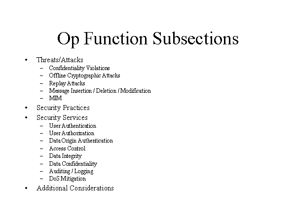 Op Function Subsections Threats/Attacks Confidentiality Violations Offline Cryptographic Attacks Replay Attacks Message Insertion / Deletion / Modification MIM Security Practices Security Services User Authentication User Authorization Data Origin Authentication Access Control Data Integrity Data Confidentiality Auditing / Logging DoS Mitigation Additional Considerations |