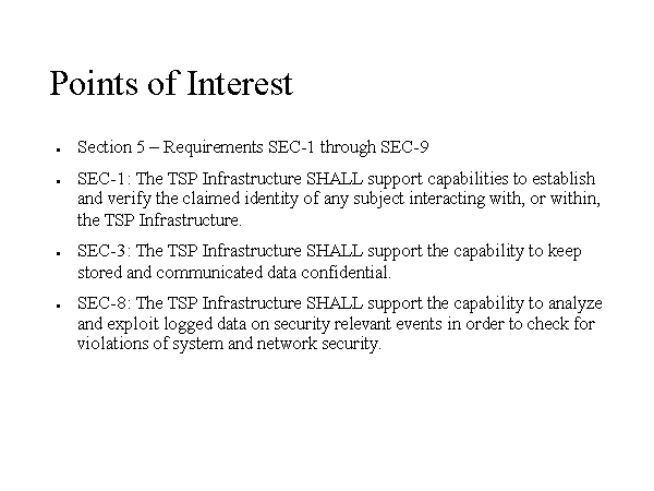 Points of Interest Section 5 – Requirements SEC-1 through SEC-9 SEC-1: The TSP Infrastructure SHALL support capabilities to establish and verify the claimed identity of any subject interacting with, or within, the TSP Infrastructure. SEC-3: The TSP Infrastructure SHALL support the capability to keep stored and communicated data confidential. SEC-8: The TSP Infrastructure SHALL support the capability to analyze and exploit logged data on security relevant events in order to check for violations of system and network security. |