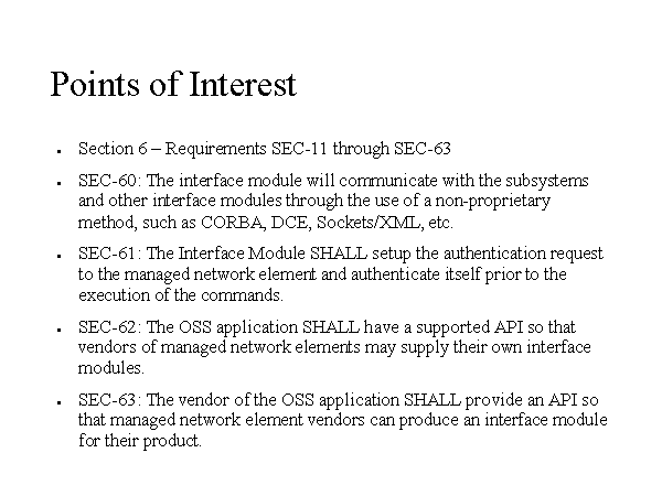 Points of Interest Section 6 – Requirements SEC-11 through SEC-63 SEC-60: The interface module will communicate with the subsystems and other interface modules through the use of a non-proprietary method, such as CORBA, DCE, Sockets/XML, etc. SEC-61: The Interface Module SHALL setup the authentication request to the managed network element and authenticate itself prior to the execution of the commands. SEC-62: The OSS application SHALL have a supported API so that vendors of managed network elements may supply their own interface modules. SEC-63: The vendor of the OSS application SHALL provide an API so that managed network element vendors can produce an interface module for their product. |