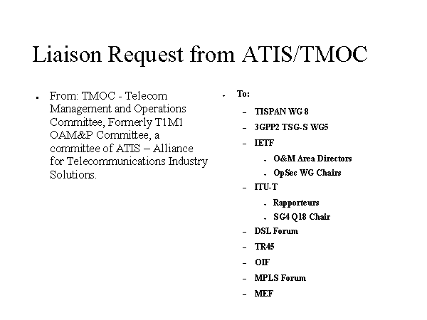 Liaison Request from ATIS/TMOC From: TMOC - Telecom Management and Operations Committee, Formerly T1M1 OAM&P Committee, a committee of ATIS – Alliance for Telecommunications Industry Solutions. To: TISPAN WG 8 3GPP2 TSG-S WG5 IETF O&M Area Directors OpSec WG Chairs ITU-T Rapporteurs SG4 Q18 Chair DSL Forum TR45 OIF MPLS Forum MEF |