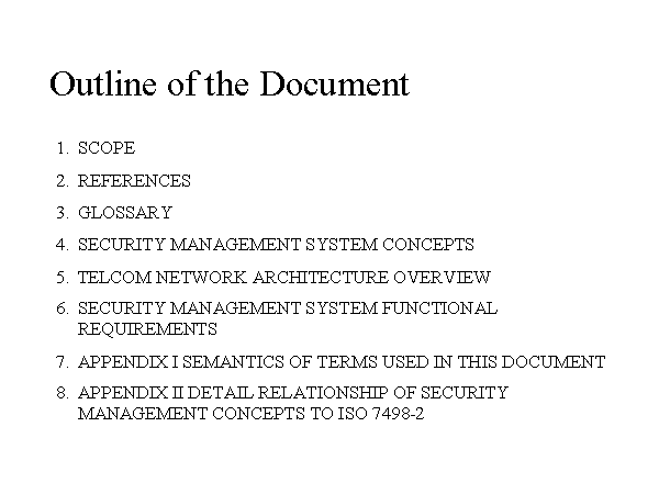 Outline of the Document SCOPE REFERENCES GLOSSARY SECURITY MANAGEMENT SYSTEM CONCEPTS TELCOM NETWORK ARCHITECTURE OVERVIEW SECURITY MANAGEMENT SYSTEM FUNCTIONAL REQUIREMENTS APPENDIX I SEMANTICS OF TERMS USED IN THIS DOCUMENT APPENDIX II DETAIL RELATIONSHIP OF SECURITY MANAGEMENT CONCEPTS TO ISO 7498-2 |