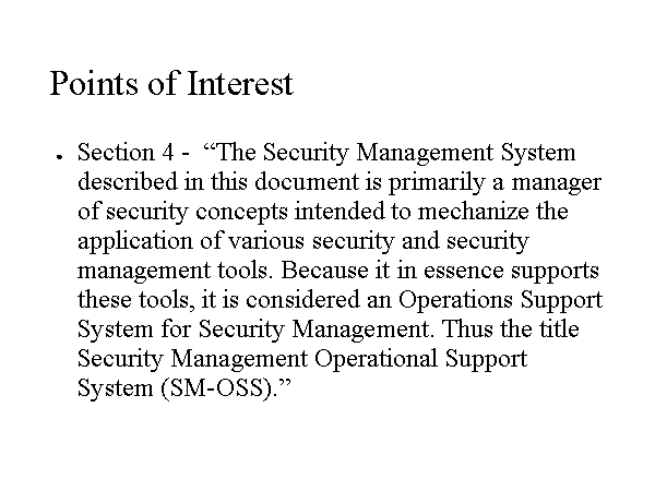 Points of Interest Section 4 - “The Security Management System described in this document is primarily a manager of security concepts intended to mechanize the application of various security and security management tools. Because it in essence supports these tools, it is considered an Operations Support System for Security Management. Thus the title Security Management Operational Support System (SM-OSS).” |
