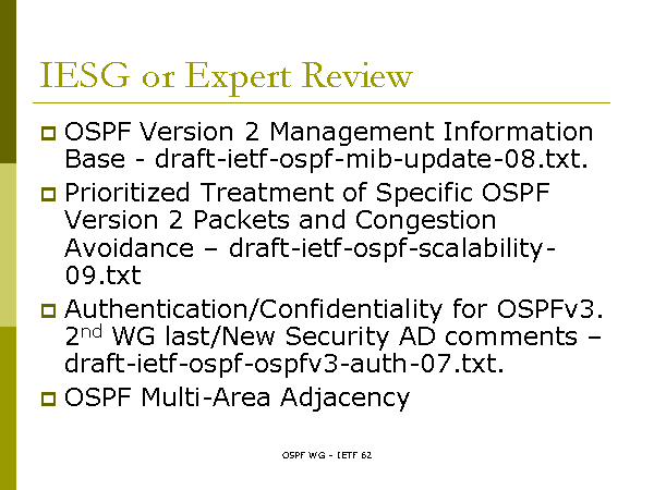 IESG or Expert Review OSPF Version 2 Management Information Base - draft-ietf-ospf-mib-update-08.txt. Prioritized Treatment of Specific OSPF Version 2 Packets and Congestion Avoidance – draft-ietf-ospf-scalability-09.txt Authentication/Confidentiality for OSPFv3. 2nd WG last/New Security AD comments –draft-ietf-ospf-ospfv3-auth-07.txt. OSPF Multi-Area Adjacency |