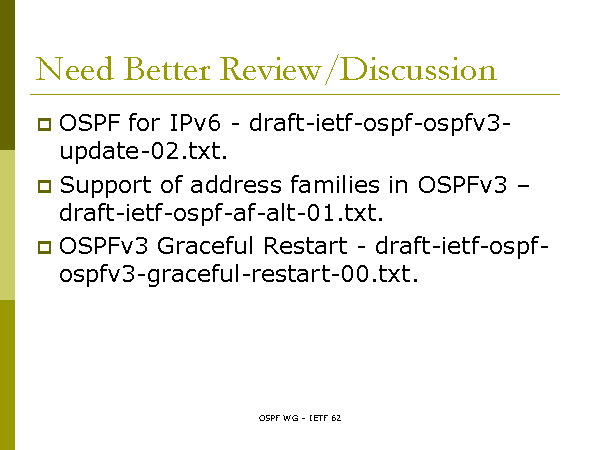 Support of address families in OSPFv3 – draft-ietf-ospf-af-alt-01.txt.