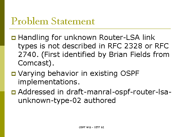 Problem Statement Handling for unknown Router-LSA link types is not described in RFC 2328 or RFC 2740. (First identified by Brian Fields from Comcast). Varying behavior in existing OSPF implementations. Addressed in draft-manral-ospf-router-lsa-unknown-type-02 authored |