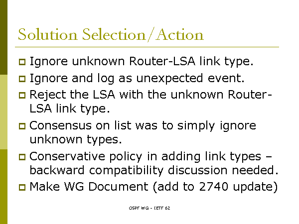 Solution Selection/Action Ignore unknown Router-LSA link type. Ignore and log as unexpected event. Reject the LSA with the unknown Router-LSA link type. Consensus on list was to simply ignore unknown types. Conservative policy in adding link types – backward compatibility discussion needed. Make WG Document (add to 2740 update) |