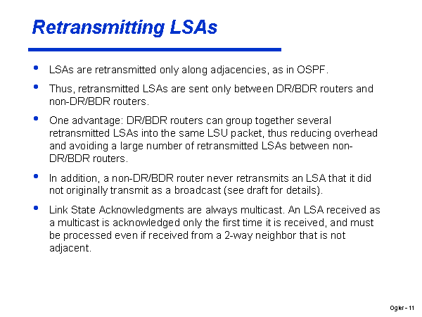 Retransmitting LSAs LSAs are retransmitted only along adjacencies, as in OSPF. Thus, retransmitted LSAs are sent only between DR/BDR routers and non-DR/BDR routers. One advantage: DR/BDR routers can group together several retransmitted LSAs into the same LSU packet, thus reducing overhead and avoiding a large number of retransmitted LSAs between non-DR/BDR routers. In addition, a non-DR/BDR router never retransmits an LSA that it did not originally transmit as a broadcast (see draft for details). Link State Acknowledgments are always multicast. An LSA received as a multicast is acknowledged only the first time it is received, and must be processed even if received from a 2-way neighbor that is not adjacent. |