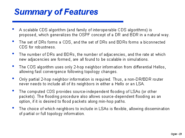 Summary of Features A scalable CDS algorithm (and family of interoperable CDS algorithms) is proposed, which generalizes the OSPF concept of a DR and BDR in a natural way. The set of DRs forms a CDS, and the set of DRs and BDRs forms a biconnected CDS for robustness. The number of DRs and BDRs, the number of adjacencies, and the rate at which new adjacencies are formed, are all found to be scalable in simulations. The CDS algorithm uses only 2-hop neighbor information from differential Hellos, allowing fast convergence following topology changes. Only partial 2-hop neighbor information is required. Thus, a non-DR/BDR router never needs to include all of its neighbors in either a Hello or an LSA. The computed CDS provides source-independent flooding of LSAs (or other packets). The flooding procedure also allows source-dependent flooding as an option, if it is desired to flood packets along min-hop paths. The choice of which neighbors to include in LSAs is flexible, allowing dissemination of partial or full topology information. |
