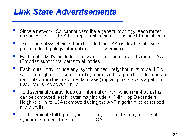 Link State Advertisements Since a network LSA cannot describe a general topology, each router originates a router LSA that represents neighbors as point-to-point links. The choice of which neighbors to include in LSAs is flexible, allowing partial or full topology information to be disseminated. Each router MUST include all fully adjacent neighbors in its router LSA. (Provides suboptimal paths to all nodes.) Each router may include any “synchronized” neighbor in its router LSA, where a neighbor j is considered synchronized if a path to node j can be calculated from the link-state database (implying there exists a path to node j via fully adjacent links). To disseminate partial topology information from which min-hop paths can be computed, each router may include all “Min-Hop Dependent Neighbors” in its LSA (computed using the ANP algorithm as described in the draft). To disseminate full topology information, each router may include all synchronized neighbors in its router LSA. |