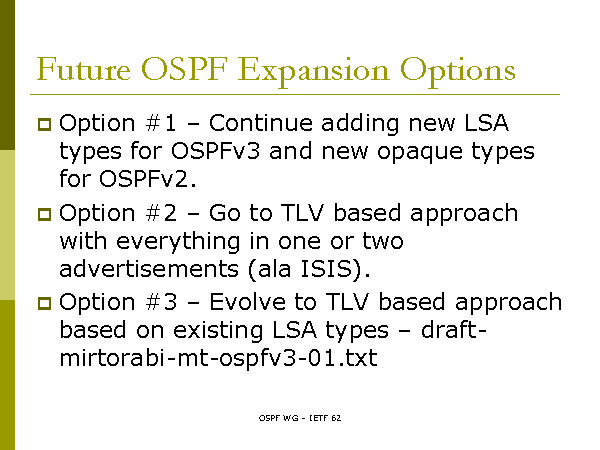 Future OSPF Expansion Options Option #1 – Continue adding new LSA types for OSPFv3 and new opaque types for OSPFv2. Option #2 – Go to TLV based approach with everything in one or two advertisements (ala ISIS). Option #3 – Evolve to TLV based approach based on existing LSA types – draft-mirtorabi-mt-ospfv3-01.txt |