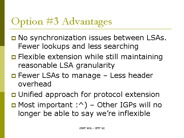Option #3 Advantages No synchronization issues between LSAs. Fewer lookups and less searching Flexible extension while still maintaining reasonable LSA granularity Fewer LSAs to manage – Less header overhead Unified approach for protocol extension Most important :^) – Other IGPs will no longer be able to say we’re inflexible |