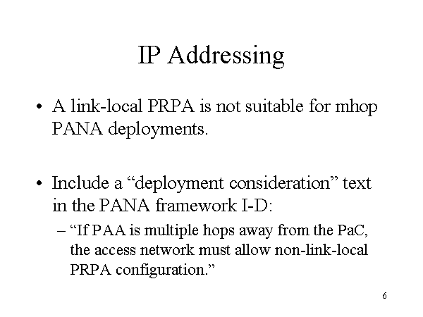 IP Addressing A link-local PRPA is not suitable for mhop PANA deployments. Include a “deployment consideration” text in the PANA framework I-D: “If PAA is multiple hops away from the PaC, the access network must allow non-link-local PRPA configuration.” |