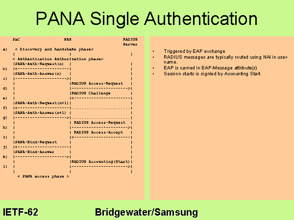 PANA Single Authentication PaC NAS RADIUS Server a) < Discovery and handshake phase> | | | < Authentication Authorization phase> |PANA-Auth-Request(x) | | b) |<---------------------| | |PANA-Auth-Answer(x) | | c) |--------------------->| | | |RADIUS Access-Request | d) | |----------------------->| | |RADIUS Challenge | e) | |<-----------------------| |PANA-Auth-Request(x+1)| | f) |<---------------------|........................| |PANA-Auth-Answer(x+1) | | g) |--------------------->|........................| | | RADIUS Access-Request | h) | |----------------------->| | | RADIUS Access-Accept | i) | |<-----------------------| |PANA-Bind-Request | | j) |<---------------------| | |PANA-Bind-Answer | | k) |--------------------->| | | |RADIUS Accounting(Start)| l) | |----------------------->| | | | < PANA access phase > Triggered by EAP exchange RADIUS messages are typically routed using NAI in user-name. EAP is carried in EAP-Message attribute(s) Session starts is signled by Accounting Start |