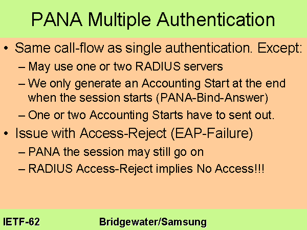 PANA Multiple Authentication Same call-flow as single authentication. Except: May use one or two RADIUS servers We only generate an Accounting Start at the end when the session starts (PANA-Bind-Answer) One or two Accounting Starts have to sent out. Issue with Access-Reject (EAP-Failure) PANA the session may still go on RADIUS Access-Reject implies No Access!!! |
