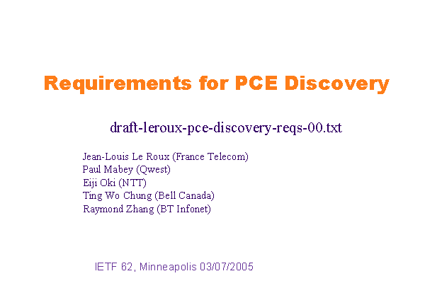 Requirements for PCE Discovery draft-leroux-pce-discovery-reqs-00.txt Jean-Louis Le Roux (France Telecom) Paul Mabey (Qwest) Eiji Oki (NTT) Ting Wo Chung (Bell Canada) Raymond Zhang (BT Infonet) IETF 62, Minneapolis 03/07/2005 |