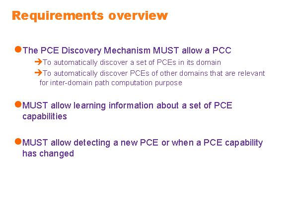 Requirements overview The PCE Discovery Mechanism MUST allow a PCC To automatically discover a set of PCEs in its domain To automatically discover PCEs of other domains that are relevant for inter-domain path computation purpose MUST allow learning information about a set of PCE capabilities MUST allow detecting a new PCE or when a PCE capability has changed |