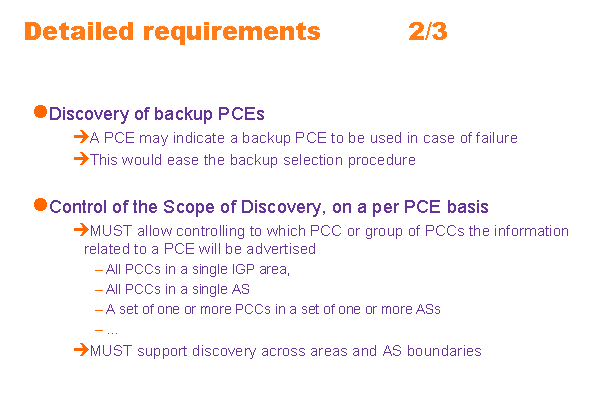 Detailed requirements 2/3 Discovery of backup PCEs A PCE may indicate a backup PCE to be used in case of failure This would ease the backup selection procedure Control of the Scope of Discovery, on a per PCE basis MUST allow controlling to which PCC or group of PCCs the information related to a PCE will be advertised All PCCs in a single IGP area, All PCCs in a single AS A set of one or more PCCs in a set of one or more ASs … MUST support discovery across areas and AS boundaries |