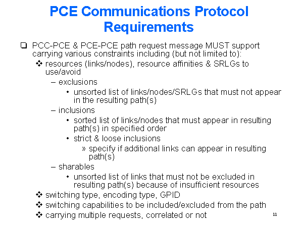 PCE Communications Protocol Requirements PCC-PCE & PCE-PCE path request message MUST support carrying various constraints including (but not limited to): resources (links/nodes), resource affinities & SRLGs to use/avoid exclusions unsorted list of links/nodes/SRLGs that must not appear in the resulting path(s) inclusions sorted list of links/nodes that must appear in resulting path(s) in specified order strict & loose inclusions specify if additional links can appear in resulting path(s) sharables unsorted list of links that must not be excluded in resulting path(s) because of insufficient resources switching type, encoding type, GPID switching capabilities to be included/excluded from the path carrying multiple requests, correlated or not |