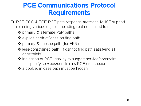 PCE Communications Protocol Requirements PCE-PCC & PCE-PCE path response message MUST support returning various objects including (but not limited to): primary & alternate P2P paths explicit or strict/loose routing path primary & backup path (for FRR) less-constrained path (if cannot find path satisfying all constraints) indication of PCE inability to support service/constraint specify services/constraints PCE can support a cookie, in case path must be hidden |