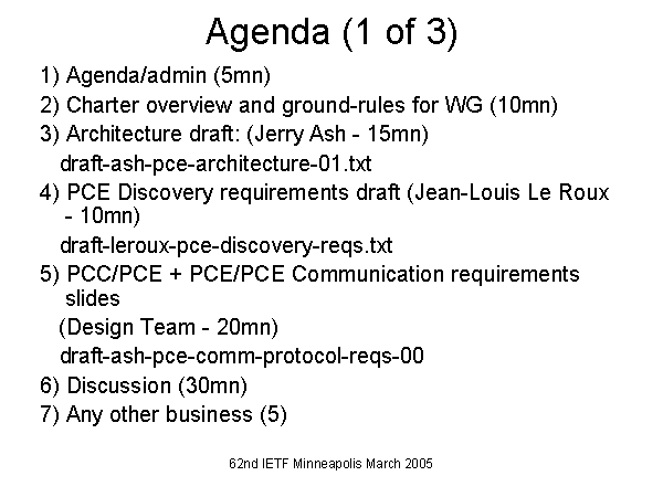 Agenda (1 of 3) 1) Agenda/admin (5mn) 2) Charter overview and ground-rules for WG (10mn) 3) Architecture draft: (Jerry Ash - 15mn) draft-ash-pce-architecture-01.txt 4) PCE Discovery requirements draft (Jean-Louis Le Roux - 10mn) draft-leroux-pce-discovery-reqs.txt 5) PCC/PCE + PCE/PCE Communication requirements slides (Design Team - 20mn) draft-ash-pce-comm-protocol-reqs-00 6) Discussion (30mn) 7) Any other business (5) |