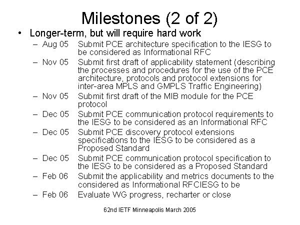 Milestones (2 of 2) Longer-term, but will require hard work Aug 05 Submit PCE architecture specification to the IESG to be considered as Informational RFC Nov 05 Submit first draft of applicability statement (describing the processes and procedures for the use of the PCE architecture, protocols and protocol extensions for inter-area MPLS and GMPLS Traffic Engineering) Nov 05 Submit first draft of the MIB module for the PCE protocol Dec 05 Submit PCE communication protocol requirements to the IESG to be considered as an Informational RFC Dec 05 Submit PCE discovery protocol extensions specifications to the IESG to be considered as a Proposed Standard Dec 05 Submit PCE communication protocol specification to the IESG to be considered as a Proposed Standard Feb 06 Submit the applicability and metrics documents to the considered as Informational RFCIESG to be Feb 06 Evaluate WG progress, recharter or close |