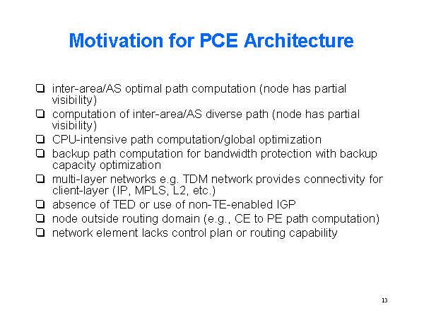 Motivation for PCE Architecture inter-area/AS optimal path computation (node has partial visibility) computation of inter-area/AS diverse path (node has partial visibility) CPU-intensive path computation/global optimization backup path computation for bandwidth protection with backup capacity optimization multi-layer networks e.g. TDM network provides connectivity for client-layer (IP, MPLS, L2, etc.) absence of TED or use of non-TE-enabled IGP node outside routing domain (e.g., CE to PE path computation) network element lacks control plan or routing capability |