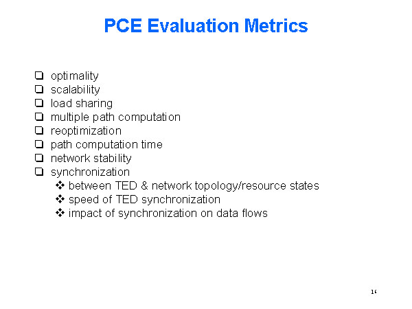 PCE Evaluation Metrics optimality scalability load sharing multiple path computation reoptimization path computation time network stability synchronization between TED & network topology/resource states speed of TED synchronization impact of synchronization on data flows |