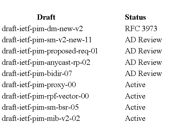 Draft Status draft-ietf-pim-dm-new-v2 RFC 3973 draft-ietf-pim-sm-v2-new-11 AD Review draft-ietf-pim-proposed-req-01 AD Review draft-ietf-pim-anycast-rp-02 AD Review draft-ietf-pim-bidir-07 AD Review draft-ietf-pim-proxy-00 Active draft-ietf-pim-rpf-vector-00 Active draft-ietf-pim-sm-bsr-05 Active draft-ietf-pim-mib-v2-02 Active |