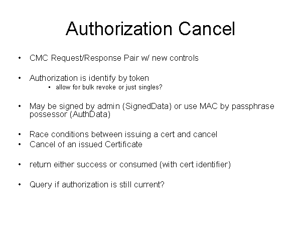 Authorization Cancel CMC Request/Response Pair w/ new controls Authorization is identify by token allow for bulk revoke or just singles? May be signed by admin (SignedData) or use MAC by passphrase possessor (AuthData) Race conditions between issuing a cert and cancel Cancel of an issued Certificate return either success or consumed (with cert identifier) Query if authorization is still current? |
