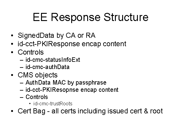 EE Response Structure SignedData by CA or RA id-cct-PKIResponse encap content Controls id-cmc-statusInfoExt id-cmc-authData CMS objects AuthData MAC by passphrase id-cct-PKIResopnse encap content Controls id-cmc-trustRoots Cert Bag - all certs including issued cert & root |