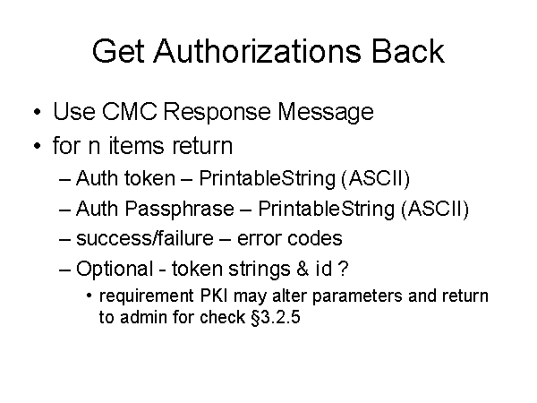 Get Authorizations Back Use CMC Response Message for n items return Auth token – PrintableString (ASCII) Auth Passphrase – PrintableString (ASCII) success/failure – error codes Optional - token strings & id ? requirement PKI may alter parameters and return to admin for check §3.2.5 |