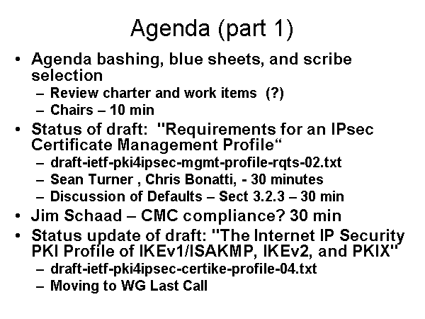 Agenda (part 1) Agenda bashing, blue sheets, and scribe selection Review charter and work items (?) Chairs – 10 min Status of draft: "Requirements for an IPsec Certificate Management Profile“ draft-ietf-pki4ipsec-mgmt-profile-rqts-02.txt Sean Turner , Chris Bonatti, - 30 minutes Discussion of Defaults – Sect 3.2.3 – 30 min Jim Schaad – CMC compliance? 30 min Status update of draft: "The Internet IP Security PKI Profile of IKEv1/ISAKMP, IKEv2, and PKIX" draft-ietf-pki4ipsec-certike-profile-04.txt Moving to WG Last Call |