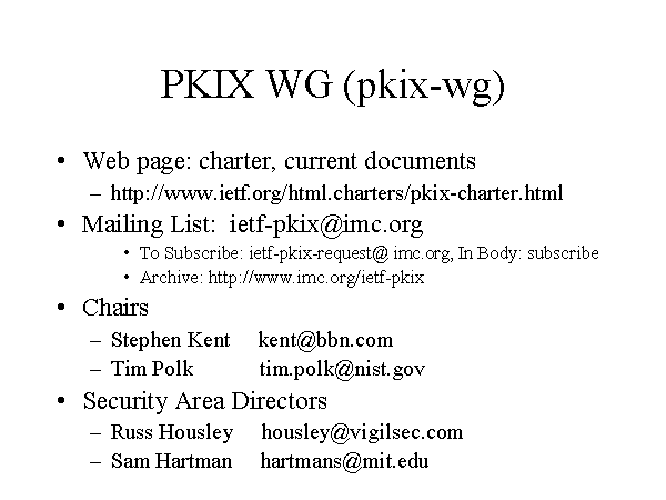 PKIX WG (pkix-wg) Web page: charter, current documents http://www.ietf.org/html.charters/pkix-charter.html Mailing List: ietf-pkix@imc.org To Subscribe: ietf-pkix-request@ imc.org, In Body: subscribe Archive: http://www.imc.org/ietf-pkix Chairs Stephen Kent kent@bbn.com Tim Polk tim.polk@nist.gov Security Area Directors Russ Housley housley@vigilsec.com Sam Hartman hartmans@mit.edu |