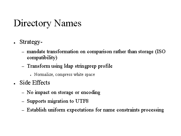 Directory Names Strategy- mandate transformation on comparison rather than storage (ISO compatibility) Transform using ldap stringprep profile Normalize, compress white space Side Effects No impact on storage or encoding Supports migration to UTF8 Establish uniform expectations for name constraints processing |