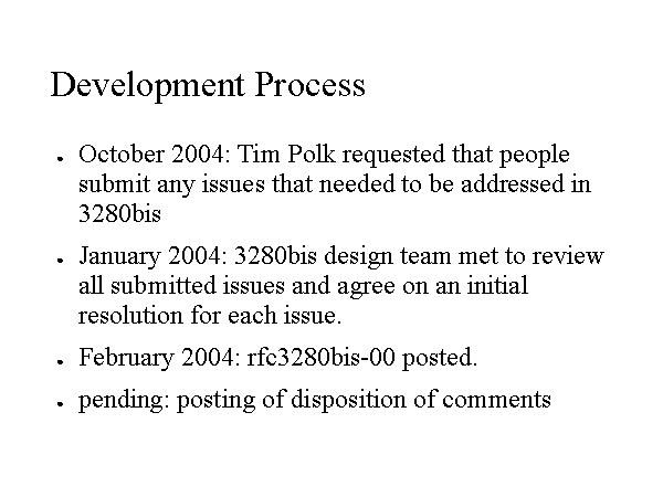 Development Process October 2004: Tim Polk requested that people submit any issues that needed to be addressed in 3280bis January 2004: 3280bis design team met to review all submitted issues and agree on an initial resolution for each issue. February 2004: rfc3280bis-00 posted. pending: posting of disposition of comments |