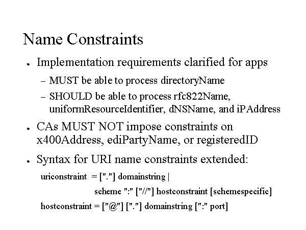 Name Constraints Implementation requirements clarified for apps MUST be able to process directoryName SHOULD be able to process rfc822Name, uniformResourceIdentifier, dNSName, and iPAddress CAs MUST NOT impose constraints on x400Address, ediPartyName, or registeredID Syntax for URI name constraints extended: uriconstraint = ["."] domainstring | scheme ":" ["//"] hostconstraint [schemespecific] hostconstraint = ["@"] ["."] domainstring [":" port] |