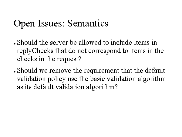 Open Issues: Semantics Should the server be allowed to include items in replyChecks that do not correspond to items in the checks in the request? Should we remove the requirement that the default validation policy use the basic validation algorithm as its default validation algorithm? |