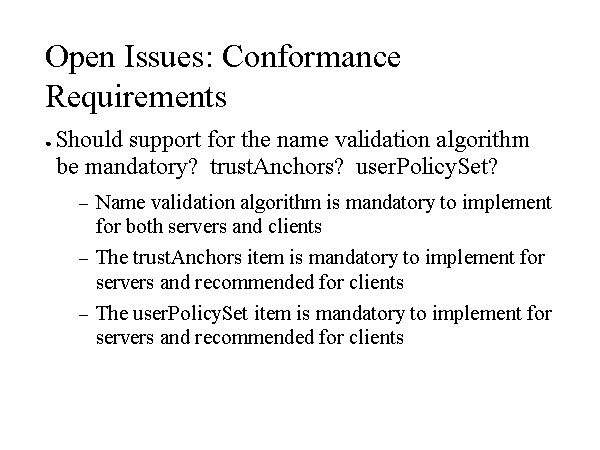 Open Issues: Conformance Requirements Should support for the name validation algorithm be mandatory? trustAnchors? userPolicySet? Name validation algorithm is mandatory to implement for both servers and clients The trustAnchors item is mandatory to implement for servers and recommended for clients The userPolicySet item is mandatory to implement for servers and recommended for clients |