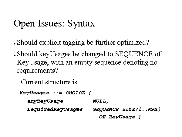 Open Issues: Syntax Should explicit tagging be further optimized? Should keyUsages be changed to SEQUENCE of KeyUsage, with an empty sequence denoting no requirements? Current structure is: KeyUsages ::= CHOICE { anyKeyUsage NULL, requiredKeyUsages SEQUENCE SIZE(1..MAX) OF KeyUsage } |